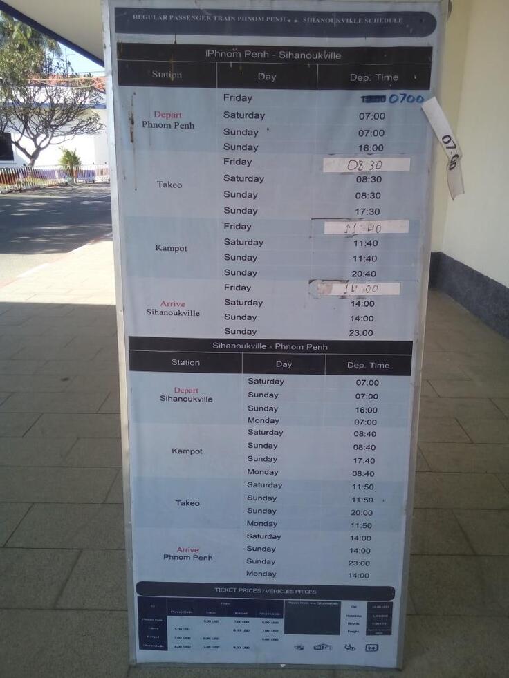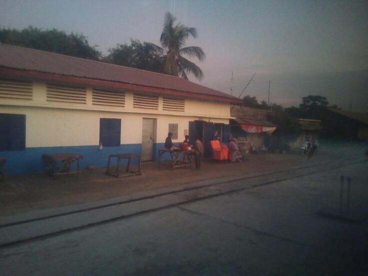 プノンペンからシハヌークヴィルに向かうこの列車は途中タケオ駅とカンポット駅に止まります。16時出発で時刻表によればタケオは17時30分。カンポットは20時40分に到着です。4時間40分。カンポットまでは150キロほどなので時速にしたら33キロぐらいですね。線路の状態が悪いのでスピードが出せません。結構揺れました。ただ線路の状態を良くしたとしても周辺の人が線路のそばで洗濯したり食事作ったり、露店を開いたり、そして子どもが遊んでいたり。危なくってしかたがありません。だから列車は頻繁に汽笛をならしまくりながら進んでいくのです。