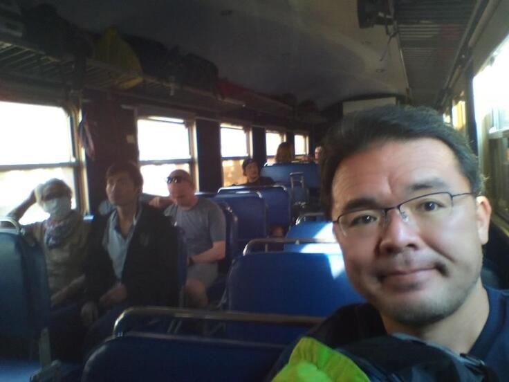 ちなみに席は指定席。あまり守られていないようですが安田はA03。客車先頭がA号車。その3番目の席ということです。一番前みたい。だからこのようなアングルで写真が取れました。ちなみに安田の横にはスタッフさんが座っています。出発後切符の回収をしてくれました。スタッフさん、あまりすることがないのか終始大音量でユーチューブや何やら見てました(^^;