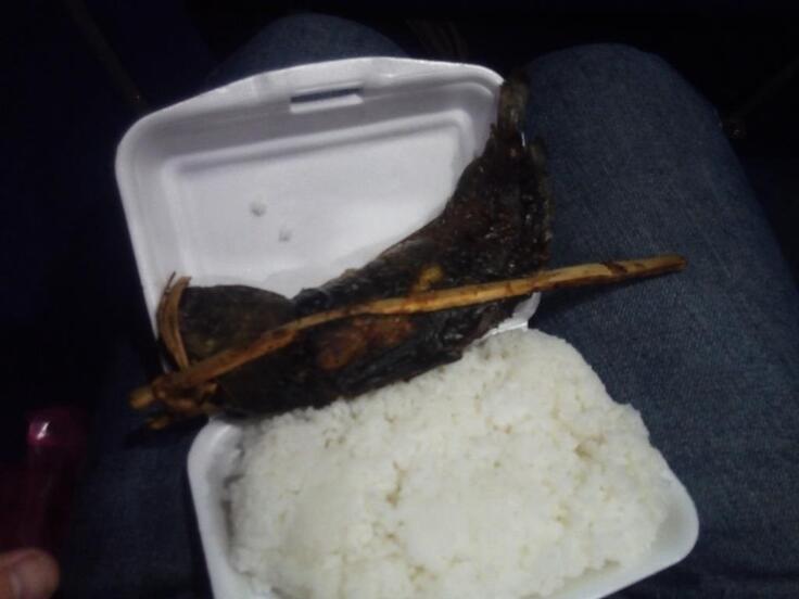 安田は焼き魚を選びました。どうです!?この写真。どうどうの焼き魚定食・・・魚は顔を確認するにナマズ系。少し骨が多いですが白身でとってもおいしかったです。それにしてもご飯多い(^^; もちろん残さず完食。車内ではみんな連れ合いと楽しくおしゃべりしながら食事を楽しんでいました。