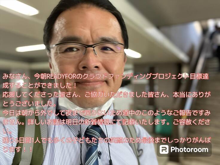 「みなさん、今朝READYFORのクラウドファンディングプロジェクト目標達成することができました!