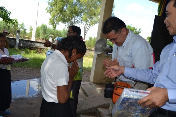 学校の先生と話したり、寄付によって建てられた女子寮を見学させてもらったりしたあと、子供たちへの文房具類のプレゼント。