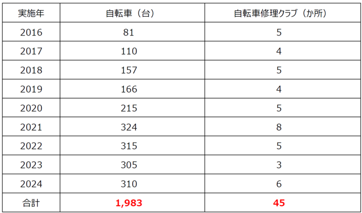2016年からはじめたこの活動ですが、これまでたくさんの方に支えていただいたおかげで、累計で1,983台の自転車の寄贈と、45か所の自転車修理クラブを設立することができました。既設の自転車修理クラブには毎年交換部品などを補給し続けています。
