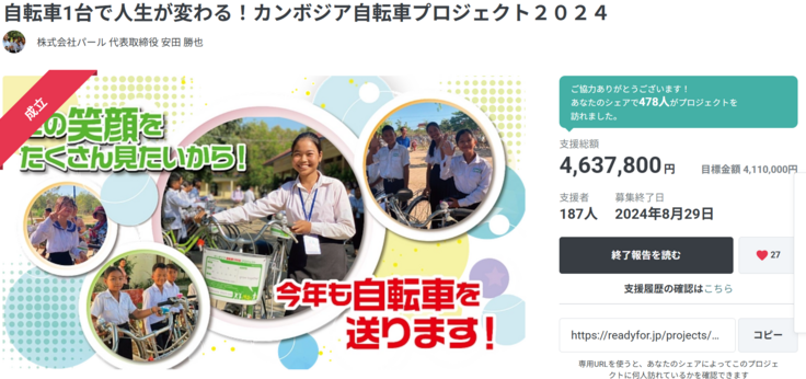 最終的には187名の方から支援していただき支援総額4,637,800円となりました。