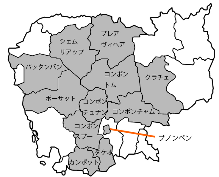 これまで11の州にある様々な中学校で活動してきました。下のカンボジアの地図でグレーで塗られているエリアです。