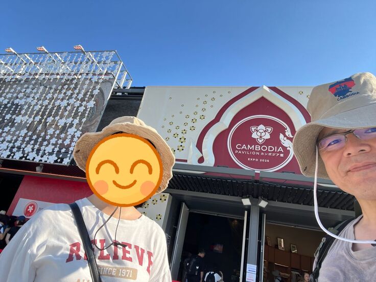 高校2年生の娘は万博2回目。1回目は高校の行事できました。彼女はそのときもカンボジア館を訪れてくれました。なのでベテランの彼女にガイドを任せていざ突入。安田はアンコールワット観光のときにかったカンボジアの地図のアイコンが書かれた帽子でばっちりオシャレ!?