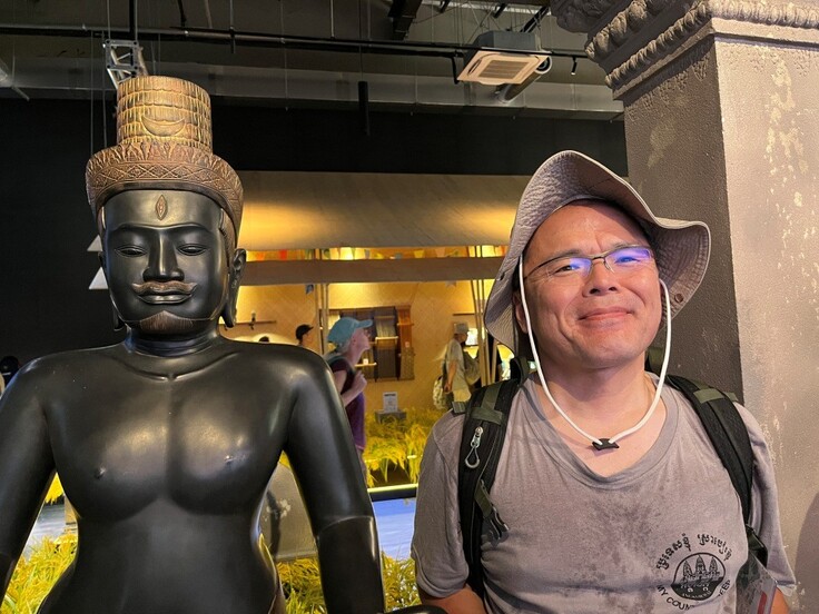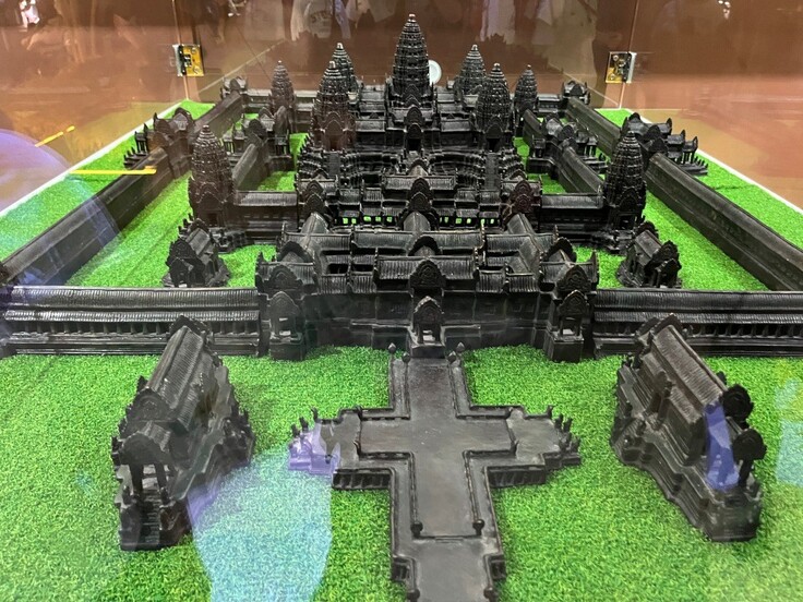 次はアンコールワットの模型。またまた安田のうんちくが・・・「外側から第1回廊、第2回廊と続いていて、第1回廊には「天国と地獄」や「乳海攪拌」といったレリーフが彫られてるねん。2024年にガイドさんと一緒にまわったとき、すごく細かく教えてくれてすごく面白かったわぁ・・・中心の塔の真ん中が一番高いやろ。あれは須弥山といってヒンズー教の宇宙観にある宇宙の中心を表してるんやで・・・」