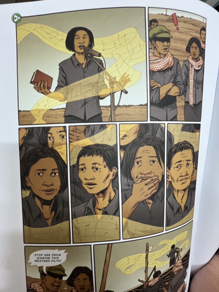 ちなみに写真のページ。ロ・セレイソティアはクメール・ルージュに「皆がもっと労働にいそしむように高揚する労働歌を歌え」と指示されますが、歌手としてのプライドで彼女は自分が昔うたっていた歌謡曲を歌いだします。すぐに歌うのを止められ彼女はクメール・ルージュに連れていかれてしまいます。彼女が自分の歌いたい曲を歌ったシーンで涙が止まらなくなりました。