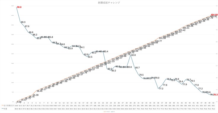 トータル454.00キロとなり450キロを超えました。ゴールの464キロが目前まで見えてきました。