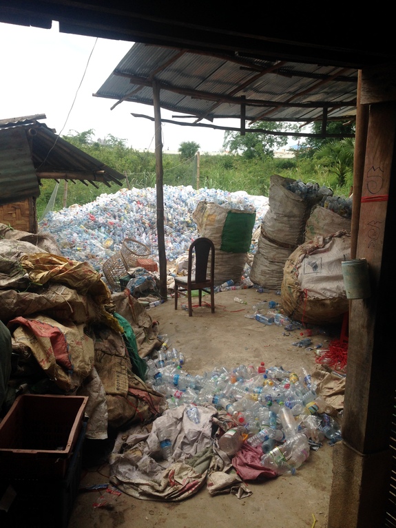 ペットボトルを回収し、ラベルのビニールを外して粉砕機にかけ