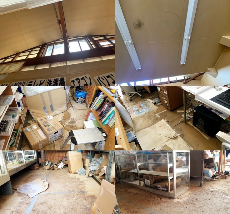 店内は停電しており、写真で見てわかる通り商品が水没して泥だらけ、パソコンなどの電子機器も使用不可。店内に泥が堆積、建物も雨漏れなども発生しており、店舗の再開には大規模な修繕が必要になります。