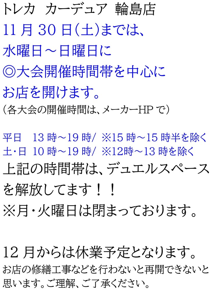 頑張ってます! 11月30日(土)まで カード大会を開催中 デュエルスペースは解放します。11/17