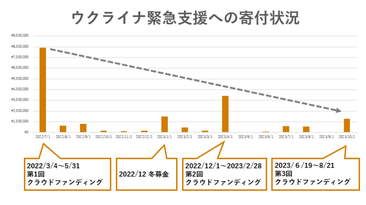 当財団においても、ロシア侵攻が始まった2022年2月直後には非常に高い関心が寄せられ、多くのご支援をいただきましたが、その後、ウクライナへの寄付金の集まりは、下降の一途を辿っています(クラウドファンディング期間を除く)。