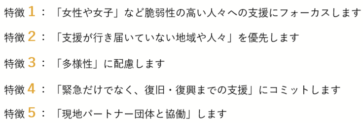 私たちは、特に女性や女子など社会的に弱い立場におかれた人々特有のニーズに応えながら、遠隔地や紛争地など、支援が届きにくい場所や人々に確実に支援をとどけます。さらに、支援地域で活動するパートナー団体や地域の人々ともに、協力して支援活動を行い、個人に加えて、社会全体の回復能力を高めることを目指しています。