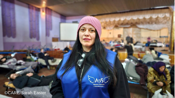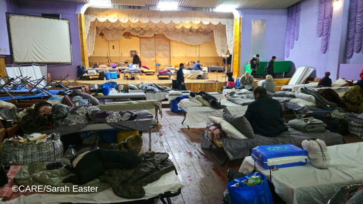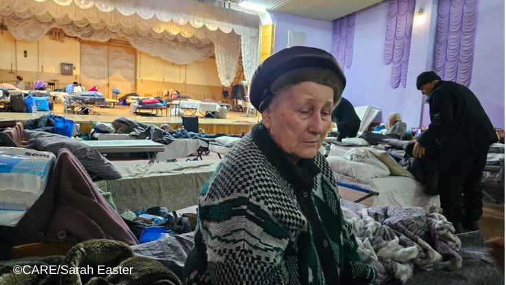 近くでは、CAREのパートナー団体のソーシャルワーカーであるタチアナが、ホールを走り回っています。彼女は避難している人々に優しい言葉をかけながら、毛布やスープを提供しています。「ラリサは今日は少し食べました」とタチアナは静かに話します。