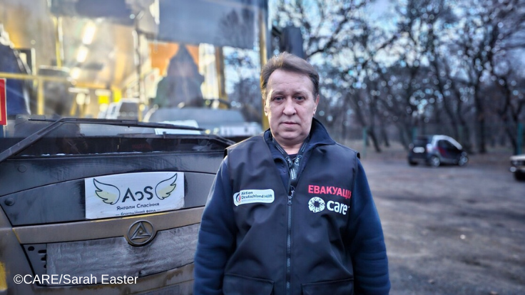 外では凍てつく風の中、かつては鮮やかな黄色でペイントされていた避難バスはペイントが汚れと灰に覆われくすんでしまっています。埃にまみれた窓には、電話番号とともに「EVACUATION」の文字が赤い太字で書かれています。毎日、CAREのパートナー団体のバスがトランジットセンターに新しい避難者を運んできます。ヴィタリイ(55歳)はそのうちの1台の運転席に座っています。バスのドアがギシギシと音を立てて開き、彼は外に出ました。彼はまるで自分の仕事の恐ろしさに麻痺している人間のように、冷静に効率よく動いています。