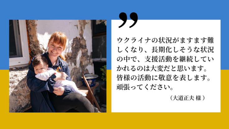 皆さまからご支援とともにお寄せいただいた、温かい応援コメントの数々に、深く感謝申し上げます。危機が長期化し、関心を持ち続けることが難しくなっている中でも、お心をお寄せ続ける皆さまからの言葉には、とても大きな力をいただいています。