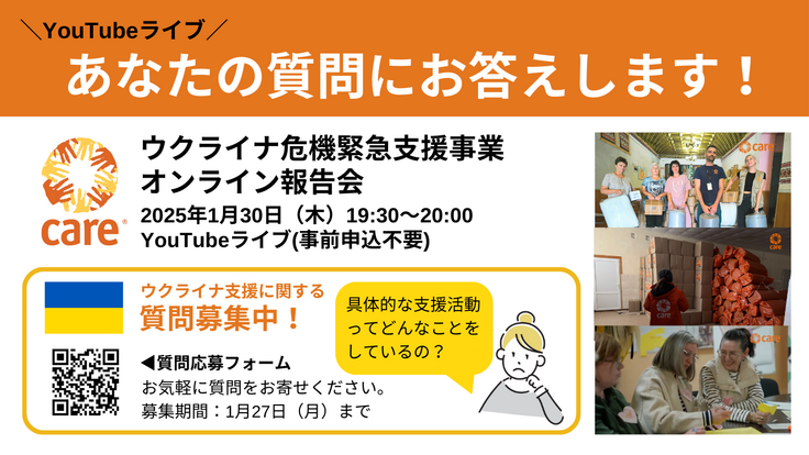 ウクライナの現状やCAREのウクライナ支援活動内容について、皆さまからお寄せいただく質問に答えるオンライン報告会を開催します。
