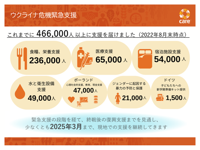 私たち国際NGO「CARE」は、ロシアの軍事侵攻の直後から、近隣国に逃れた多くの難民、そしてウクライナ国内に留まらざるを得ない人々に対して、現地パートナー団体とともに緊急人道支援を展開してきました。これまでに466,000人以上に支援を届けました(2022年8月時点)。
