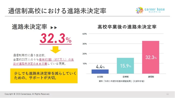 通信制高校に通う生徒数、約23万人のうち毎年約3割(約7万人)の生徒が進路未決定のまま卒業している現実があります。