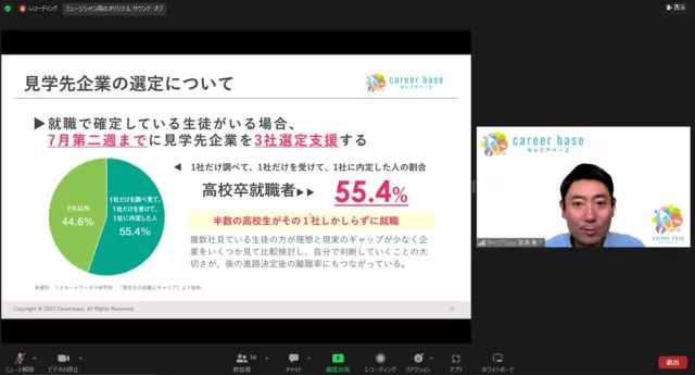 キャリアbaseでは、高校生に向けた個別伴走支援に加え、学校現場でのキャリア教育・ガイダンス等も日々行っています。就職・進学問わずキャリア教育の設計が可能であり、各学校・クラスの状況・特性に合わせて企画を行っています。