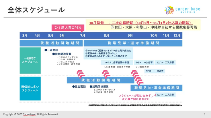 高校生の就職活動は、求人票の解禁や募集の開始、面接選考開始とスケジュールが決まっております。令和6年3月卒業の高校生は、下記が全体スケジュールです。
