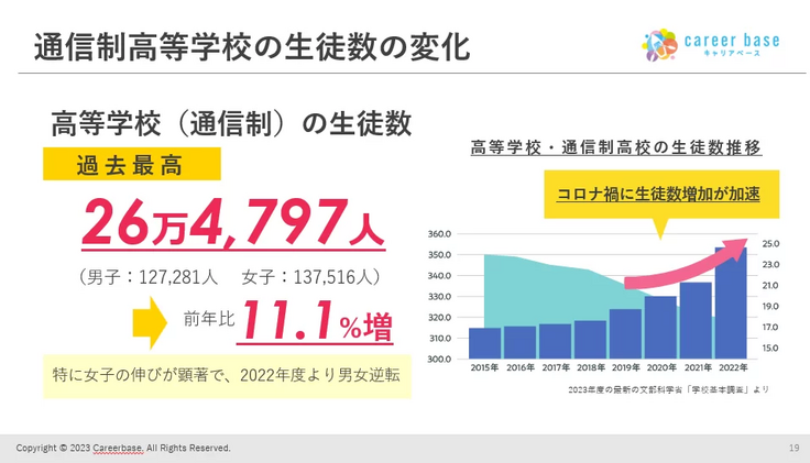 コロナ禍に、通信制高校に通う生徒数増加が加速。通信制高校に通う生徒数は、過去最高26万4,797人※と前年比11.1%増となっています。少しでも進路未決定率を減らしていくためのサポートが大切です。