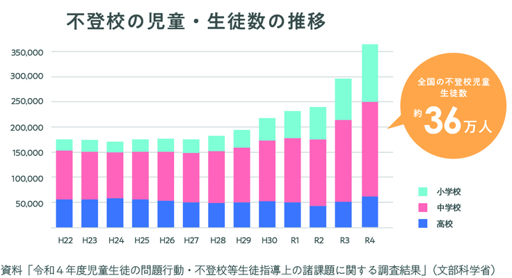文部科学省が2023年10月4日に発表した「令和4年度 児童生徒の問題行動・不登校等生徒指導上の諸課題に関する調査」によると、小・中学校における不登校児童生徒数は299,048人であり、過去最多となりました。また、中学・高校における不登校生徒数は25万人を超えています※1。