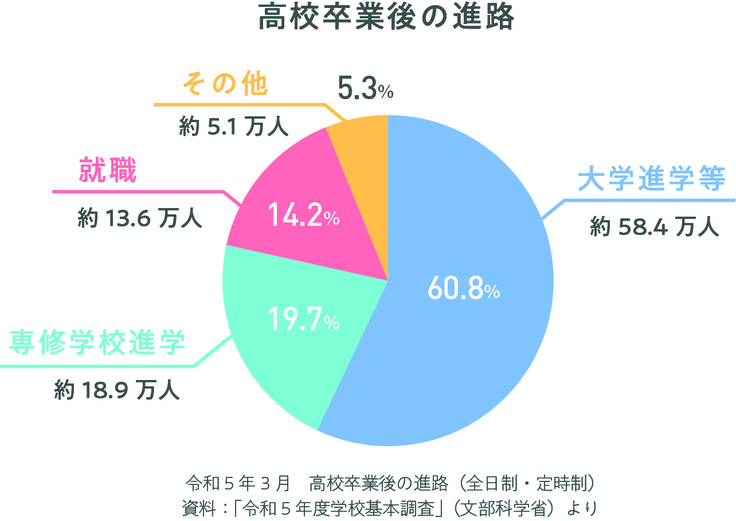 「大学全入時代」と言われる昨今ですが、令和5年3月の数字では、962,009人の卒業生(全日制・定時制)の内、約14%にあたる136,509人は就職という選択肢を選んでいます。
