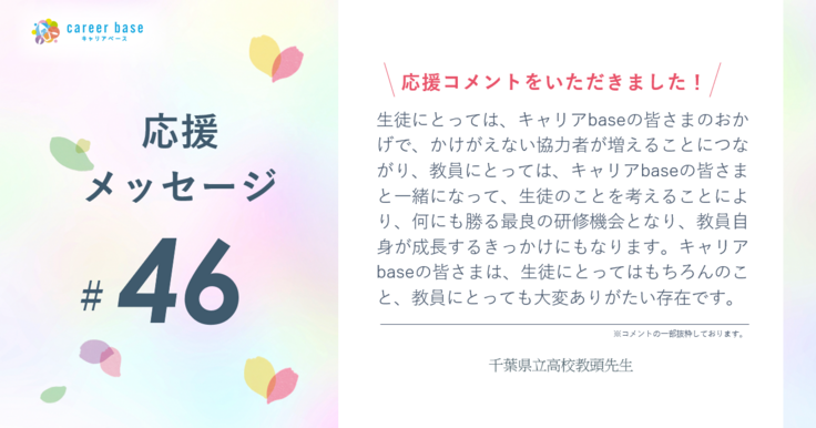 キャリアbaseの皆さまは、生徒にとってはもちろんのこと、教員にとっても大変ありがたい存在です。これからもよろしくお願いいたします。