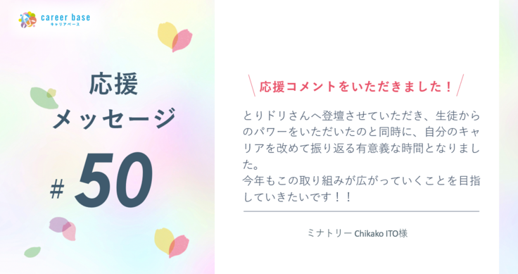 とりドリさんへ登壇させていただき、生徒からのパワーをいただいたのと同時に、自分のキャリアを改めて振り返る有意義な時間となりました。