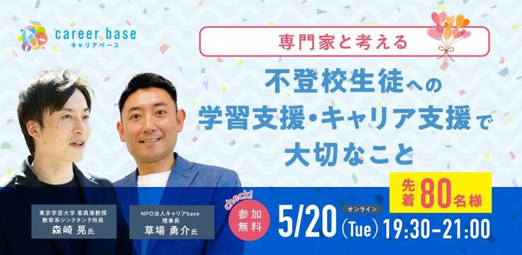本日5/20(火)19:30より開催する『専門家と考える|不登校生徒への学習支援・キャリア支援で大切なこと』オンラインイベントのご案内です。