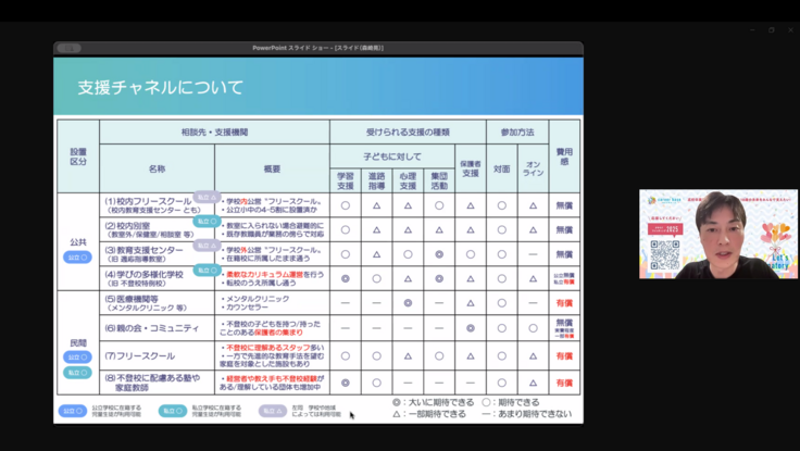 まず最初のパートでは森崎氏に登壇いただき、「不登校支援をめぐる“指導的考え方”と”支援的捉え方”」といったお話や、実際にICT教材を活用した学習支援の事例、困った時の支援チャネルのご紹介などを中心にお話しいただきました。