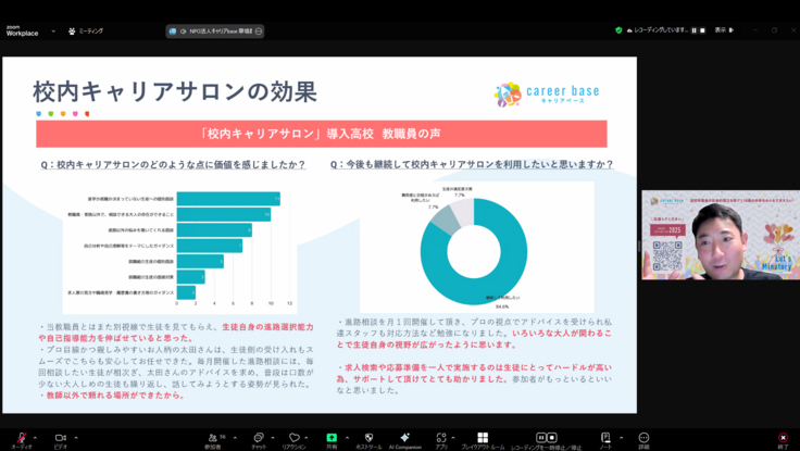 こちらのパートでは、高校生世代における不登校の現状や、データで見る通信制高校、さらには、キャリアbaseが行っている、通信制高校と連携したキャリア支援の詳細や、支援事例についてお伝えをさせていただきました。