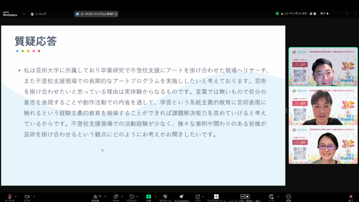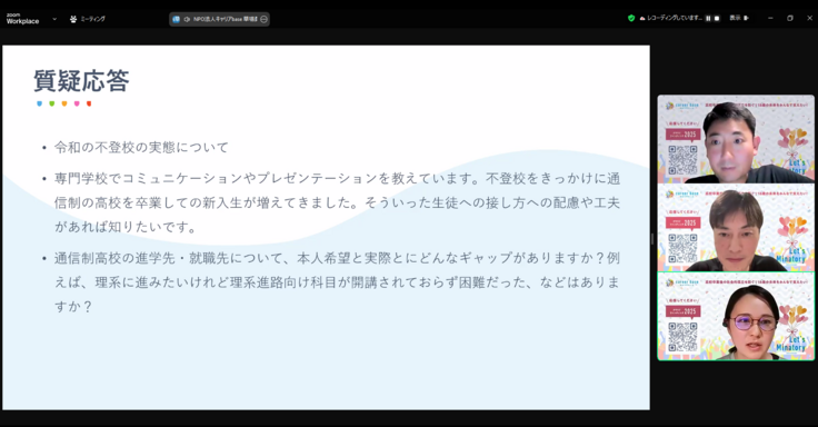 今回は事前に「当日こんな話を聞いてみたい」というリクエストや事前質問もたくさんいただいておりました。また、イベント中にもチャット欄でご質問をいただき、支援活動に携わっている皆さまからの現場での課題感、お悩み、葛藤を感じるようなご質問もありました。
