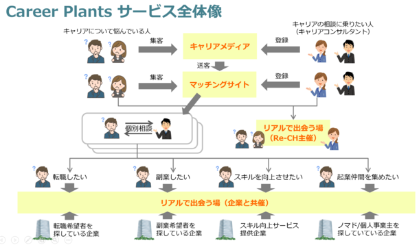 キャリアプランツでは、キャリアコンサルタントとキャリアについて悩んでいる方が、個別に相談したり、イベントなどで気軽に交流できたりすることを目指しています。