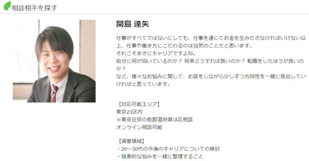 気になったキャリアコンサルタントを選択していただけますと、その方の自己紹介を見ていただけます。以下はサンプルとして、すでにこのサイトでもご紹介させて頂きましたCAREER PLANTSのディレクターも務めてくれている関島さんです。
