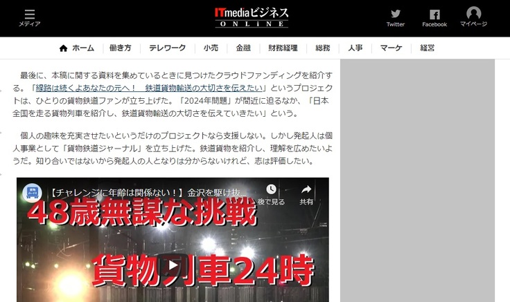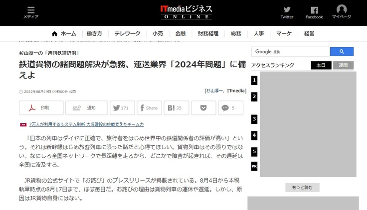 ライターをされている杉山淳一様が「ITmediaビジネスONLINE」に執筆された記事「鉄道貨物の諸問題解決が急務、運送業界「2024年問題」に備えよ」の中で、私の活動をご紹介くださいました!
