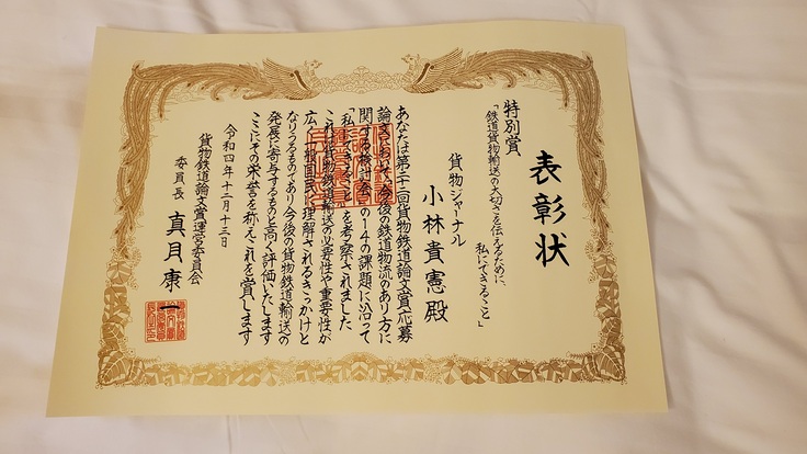貨物鉄道論文賞特別賞を頂きました!
