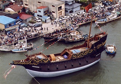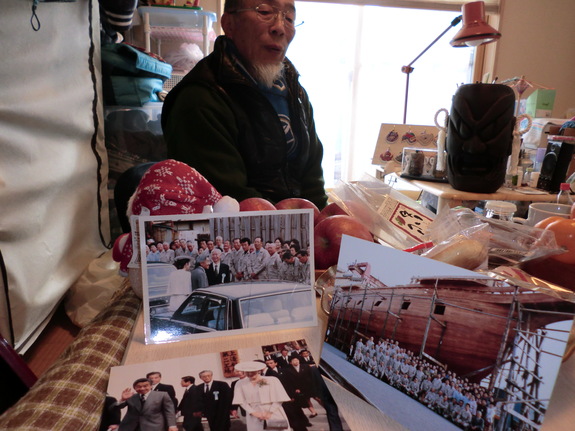 (復元船の進水式にご訪問された両陛下の写真 右の写真は復元船の前に並ぶ職人さん達でこの中に若かりし佐々木さんのお姿も)