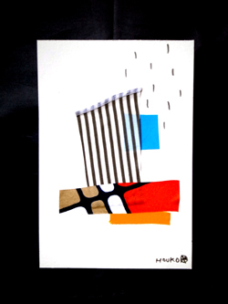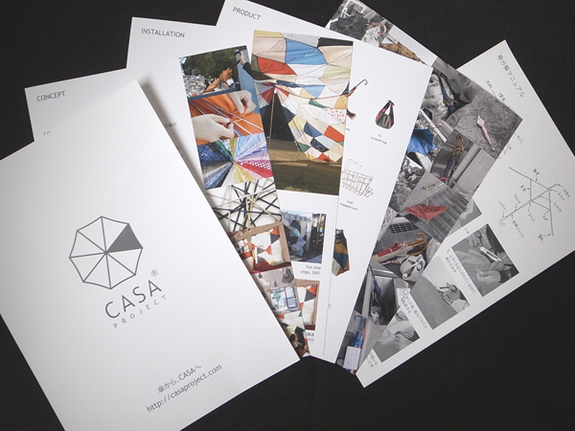 CASA PROJECTのパンフレット(A5サイズ)と、CASA PROJECT代表・HOUKOの手作りによる、傘の布を使ったコラージュ作品(ポストカード)を1枚お送りします。