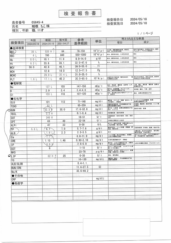 検査をすると、少し前まで治療法のなかった難病 FIPの疑いと腫瘍を発見。