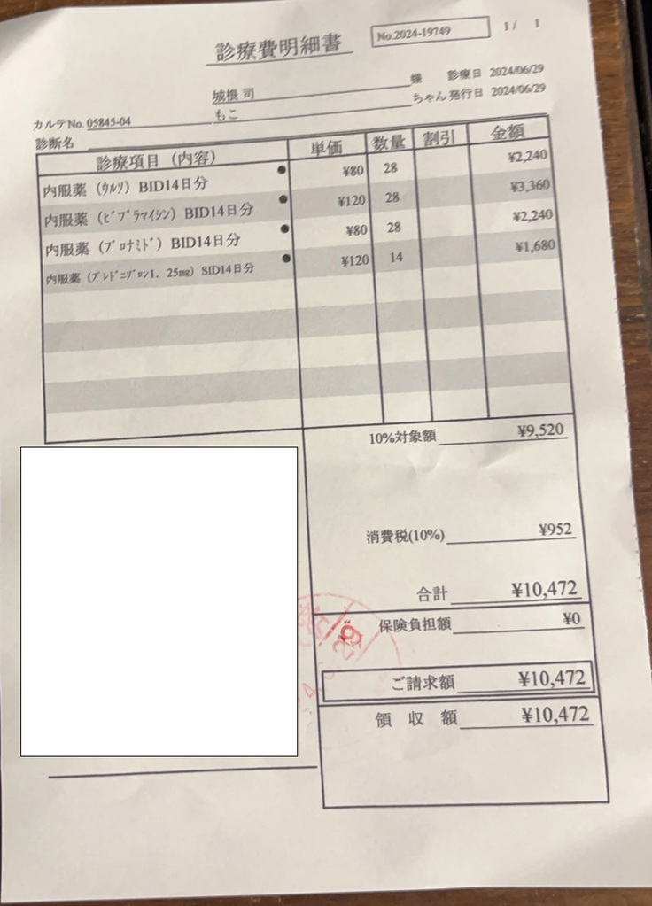 猫の難病:FPIと診断を受けて、エビデンスがある治療薬は、85日間投与 160万円。助けたいけど、さすがにこの価格は支払いが難しいので、エビデンスがないけど保険が効く治療薬を使うことに。