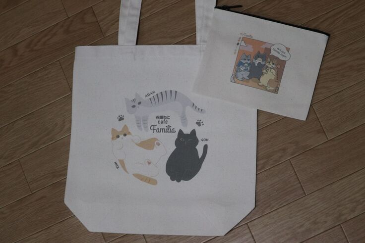 カフェの猫スタッフがモデルのオリジナルトートバッグとポーチです。