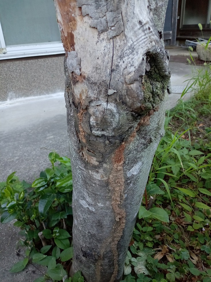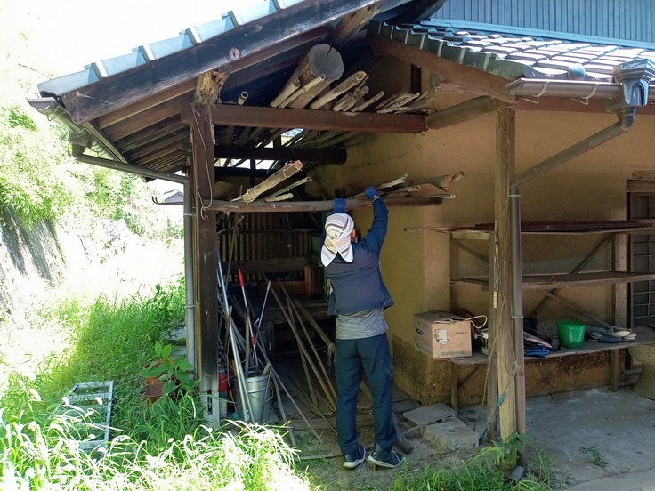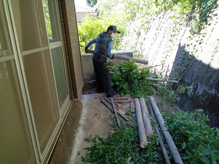 家屋の横に置かれた廃材の板や、椿の木がシロアリの巣になっていたので、ボランティアさんにお手伝いいただき廃棄しました。