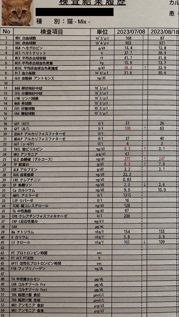 7/8時点で正常値に達していなかったり、正常値を超えていたりで赤や青で表示されていた数字は、8/18の検査で軒並み正常値に収まりました。
