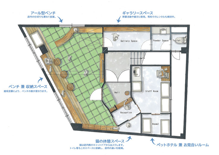 上画像の左側、緑のカーペットの部分がお客様と猫が触れ合うスペースになります🐱