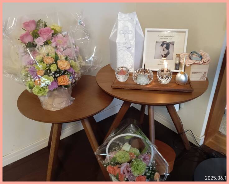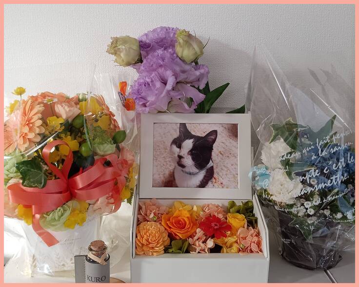 家に帰って、最初に書いたように、無、なわたし。この5日間くーちゃんの亡骸と一緒に寝てました。それもできなくなるので、一階リビングに骨つぼと遺影、二階には、いただいた写真つきのドライフラワーを遺影として(勝手にそうしてすみません)、分骨した瓶をおくことにしました。いただいたお花は、一階と二階にわけさせていただきました。飾り方がセンスないですが、長くくーちゃんによろこんでもらえるようお花大切にします。