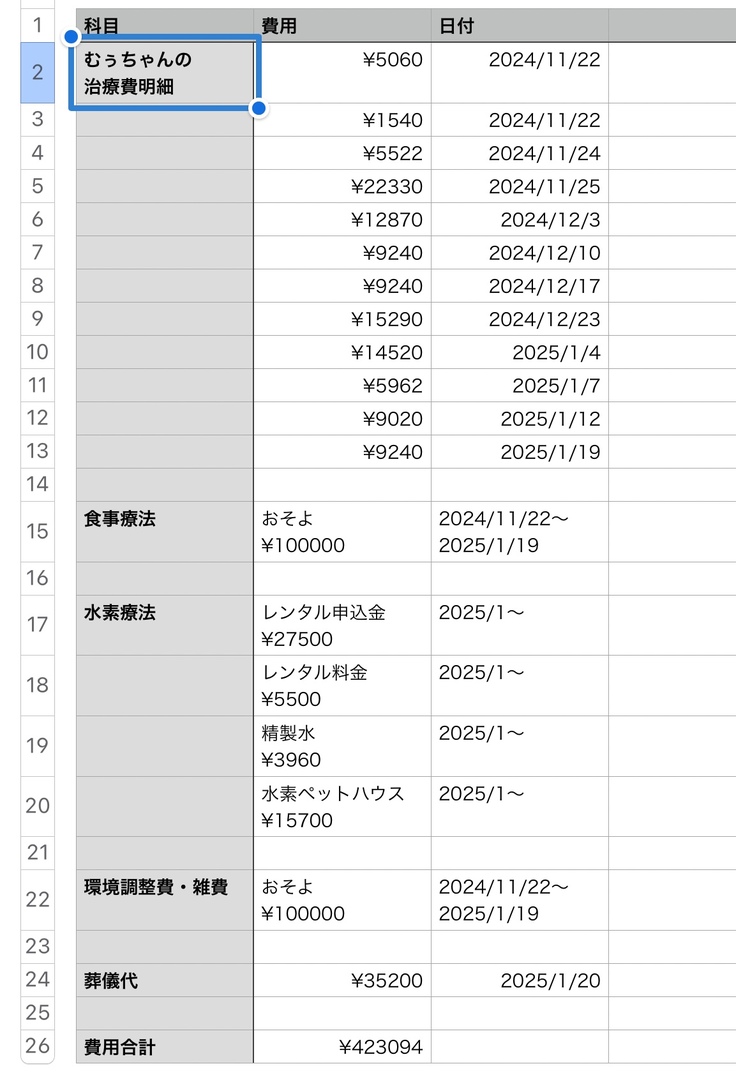 プロジェクトが継続できることになり、再度ご報告になります。1月19日にむぅちゃんが亡くなりました。たくさんのご支援・応援コメントをくださり、本当にありがとうございました。むぅちゃんは虹の橋を渡りましたが、皆様の思いを届けるため、プロジェクトは継続していきます。簡単ではありますが、これまでの費用をまとめましたのでご確認ください。