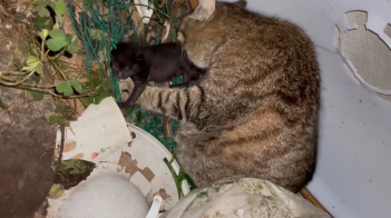 詳しく伺うと、近隣住民がネコを嫌がり水をかけ続けているようで、昨年も同母ネコは出産したが、同じように迫害行為をしたため子ネコたちは全員亡くなった、と話されました。