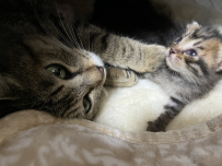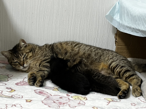 猫は環境の変化に弱いため、ひかりが子育てを継続してくれるか心配していました。が、ありがたい事に子どもたちに一生懸命向かい合う様子が確認できたため、安心して子育てを任せる事ができました。